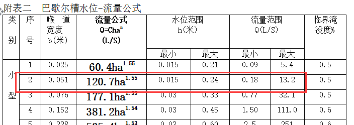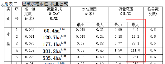第三步:根据计算出来的“12.5升/秒”去“巴歇尔槽水位-流量公式”表格里面查到对应的最大流量。