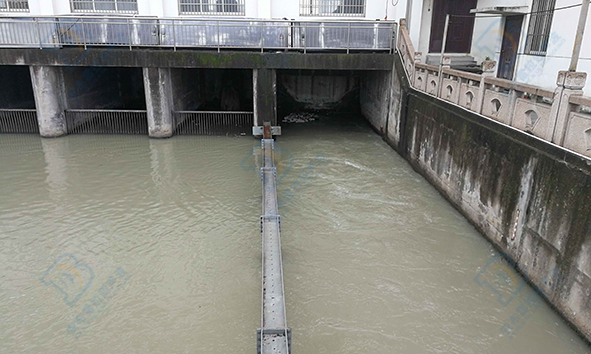 安布雷拉就派出了技术工程师刘工到现场去解决,到了现场发现这个是泵站他们有好几个闸门,但是只开最边上的一个闸门放水,河道的宽度大约是在20米左右。20米左右的河道使用了两个多普勒流量计传感器加一台主机来测量河道流速的。