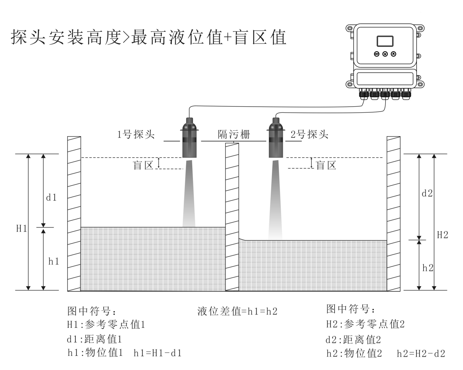 超声波液位差计由2个超声波探头和1台主机组成,是一种先进的非接触式物位测量仪器,zui常见的是在污水处理厂的污水池的进水口,测量粗格栅、细格栅前后的水位高低,计算出水位相差的高度,用来启动反捞式除污机捞出垃圾。