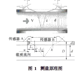 时差法超声波流量计由超声波换能器、电子转换线路、流量显示累积系统3部分组成。它利用超声波在横向穿过流动的液体时,在其顺流和逆流介质中,其超声波的速度有差异而形成速度差(时间差)。时差法超声波流量计就是利用该原理对流体的流速和流量进行测量的,其测量原理如图1所示。