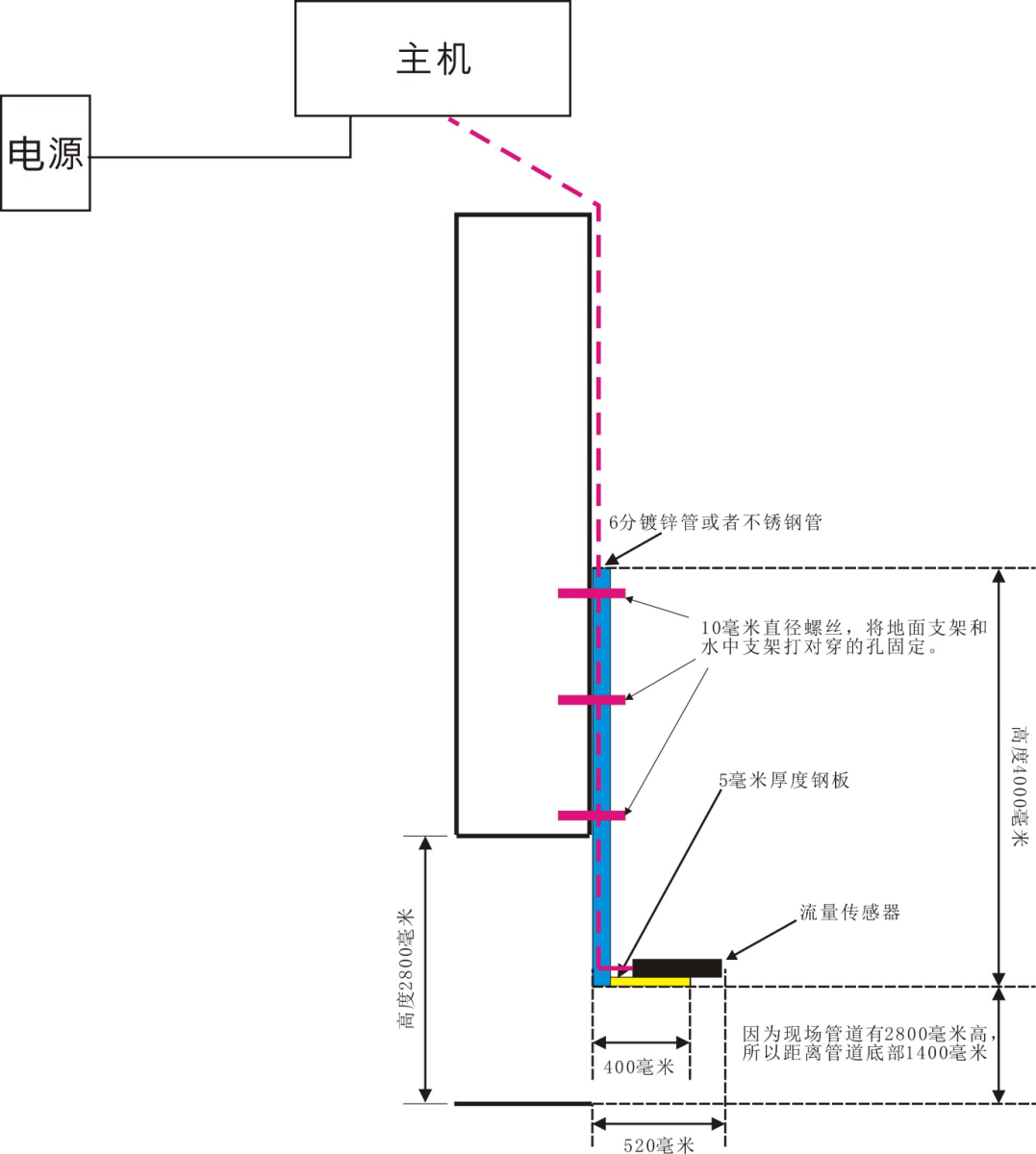 ●对于流速>1.0米/秒的现场,安装支架强度要加强到现有支架强度的3倍以上,保证激流不会冲走或者冲坏支架。并且要在水平方向上做斜撑,以支撑传感器不会被水流冲击造成移动、抖动、飘移。