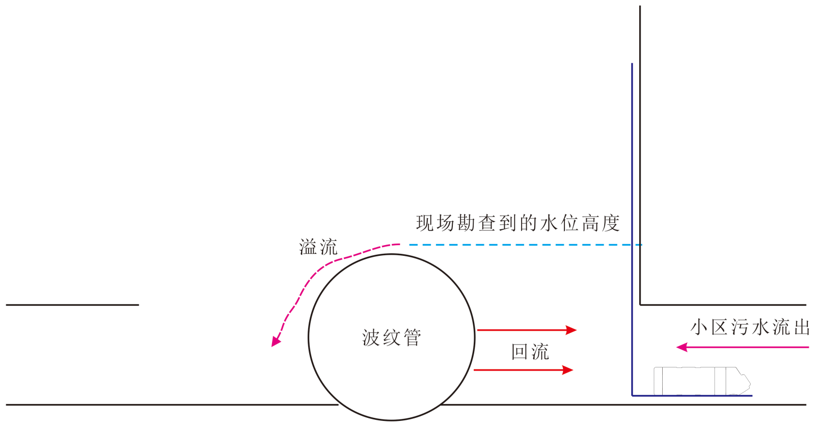 经过考察整个污水井出水管道是DN300的,污水中有垃圾、卫生纸等杂物。在井的中间有一根DN500-600的波纹管,跟出水管成垂直状态。正好挡住了出水管道的水流,使得水流只有满上来,超过波纹管之后,才能够流出去。