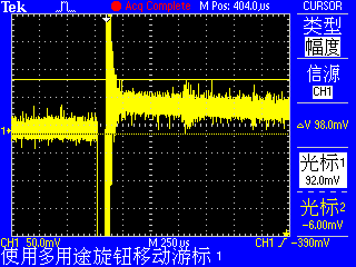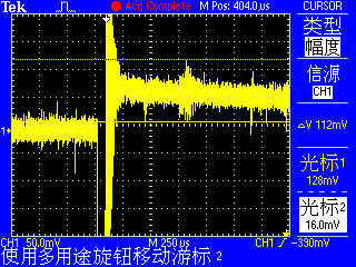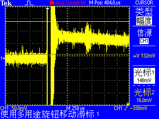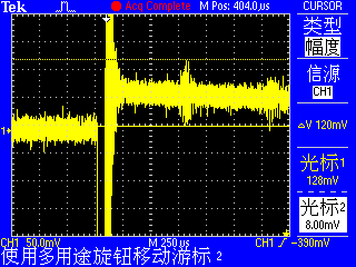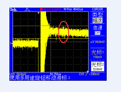 如图11红色圆圈圈出信号是161103-001号换能器20V电压驱动下的接收信号强度,该信号不明显,在不放大的情况下测试误差较大,所以此次测试在12V、16V、20V电压下只测试换能器200KHz频率点信号。