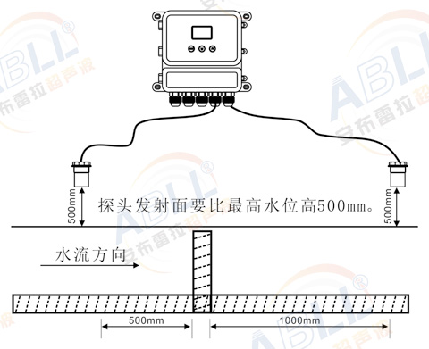 农田水利超声波明渠流量计是分体式的,在上游装一个传感器,在下游装一个传感器。上游传感器安装要距离出水口0.5米远,下游传感器安装要距离出水口1.0米以上。