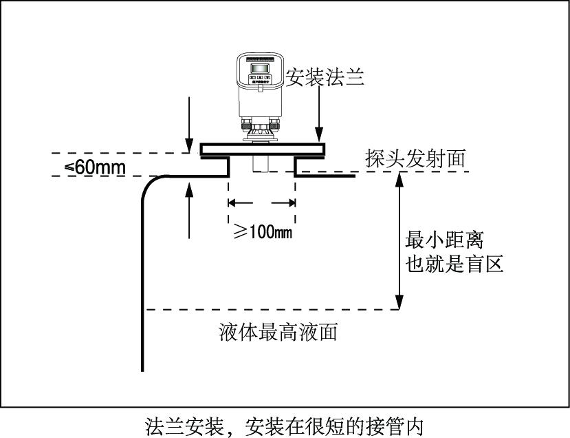 平面罐一般都有一个很短的接管,接管的基准面是法兰的下底面,在接管长度≤60mm,接管内径≥100mm,接管内壁平整无毛刺、凸起物的前提下,安装后探头的发射面低于法兰的下底面3cm就可以测量。