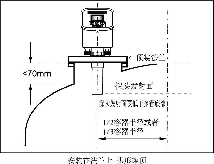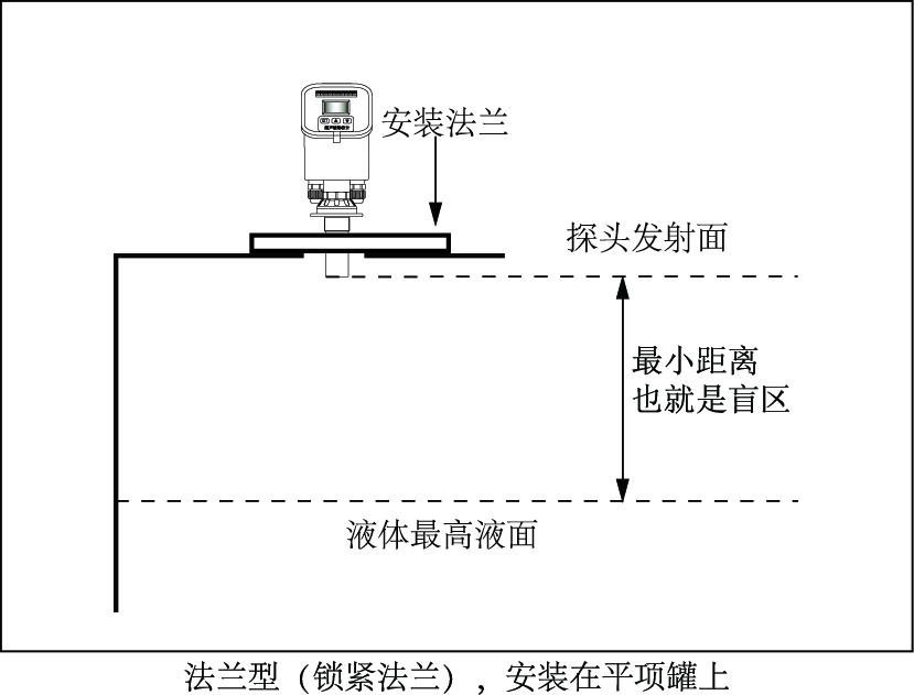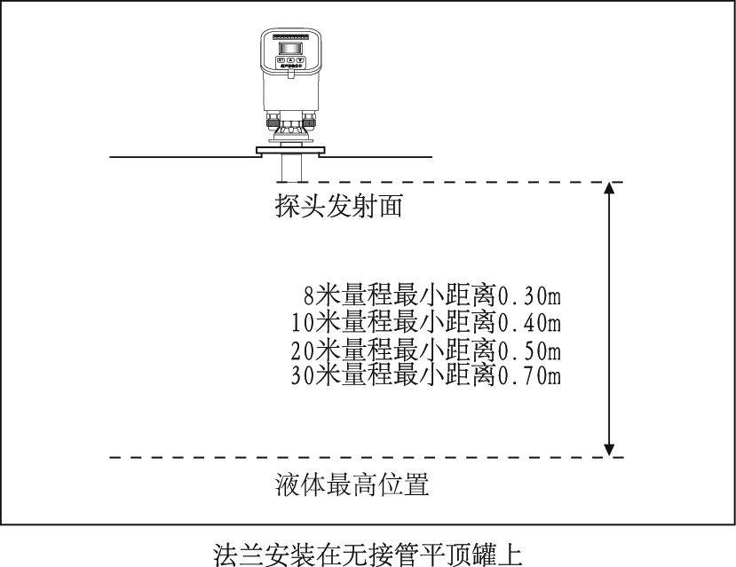 最理想的安装是直接将仪表安装在平顶容器上,不使用接管,容器上的圆形开口就可以足够固定安装用的法兰或者万向节。探头发射面是在基准面以下。