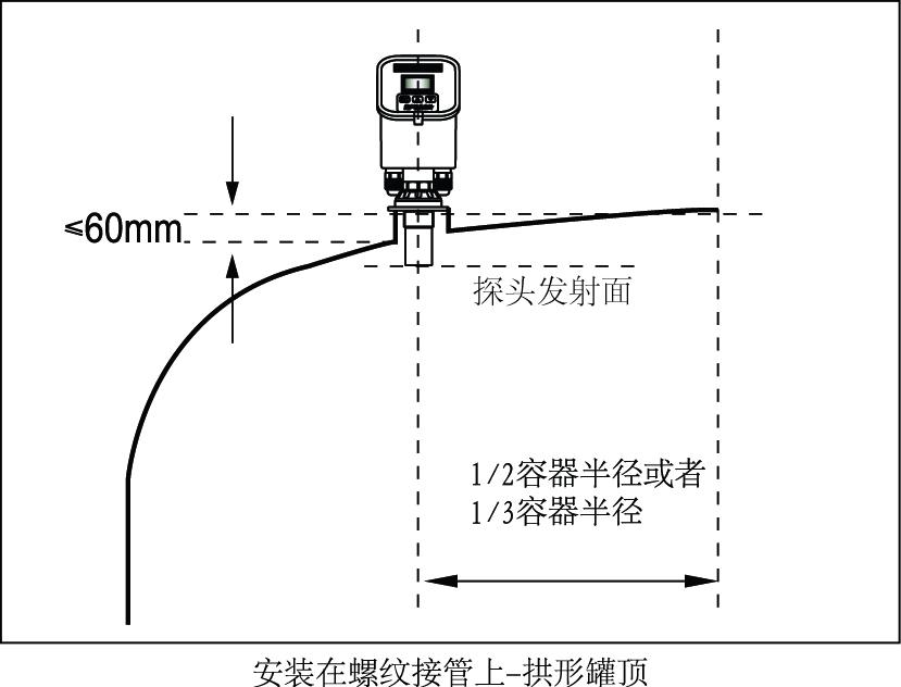 对于拱形罐,仪表最好不要安装在罐顶中央,而是安装在罐顶半径的1/2或者2/3处(在满足离罐壁一定距离的前提下)。对于超声波脉冲来讲,拱形罐顶就好像是一个凸透镜,如果探头安装在凸透镜的焦点上,那么它就会接收到所有虚假回波。因此应该尽量避免将传感器探头安装在拱形罐顶中央。