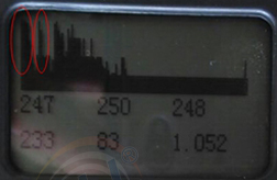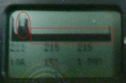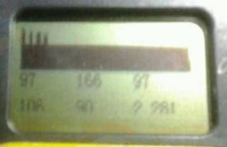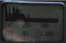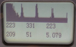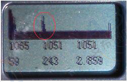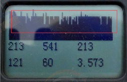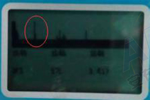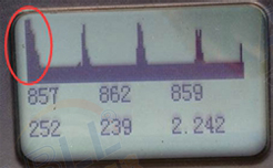 上图中左图是原图,右边是我用红色圈圈出来的。红色圈里面是一个个间距差不多的,有规律分布的波峰,这个是比较有代表性的变频器造成的电磁干扰。这里基线下面的两行数字都有数值,但是这些数值都是电磁干扰形成,没有任何意义。