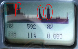 上图中,回波的底部基线变得很宽,这是因为接管把信号放大造成的。圆圈圈出来的是真实的回波,方框里面是特别粗大的基线。