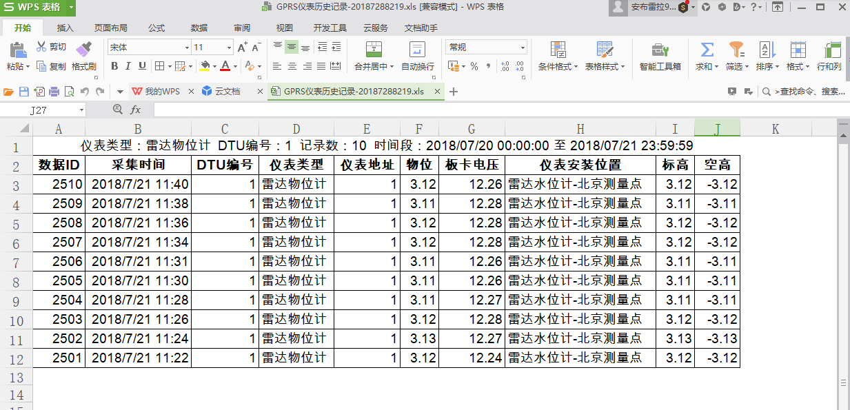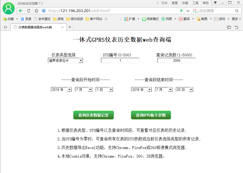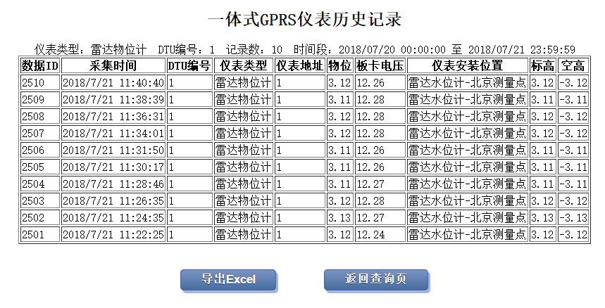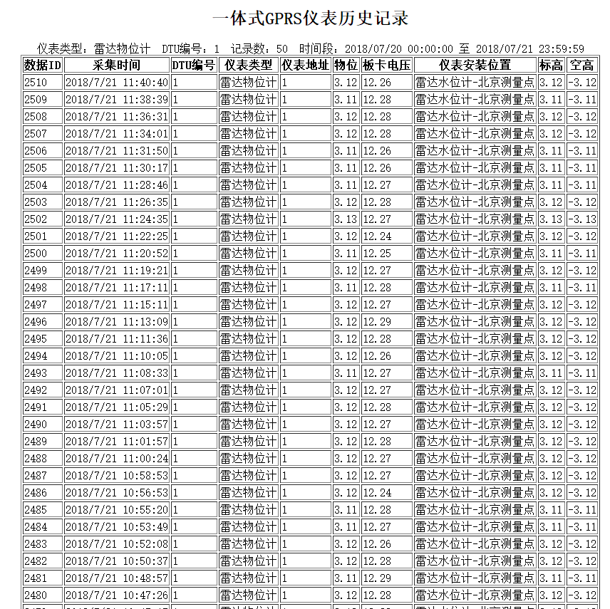 如果现场仪表是“雷达物位计”,DTU编号是“1”,我们要查询2018年7月20日-2018年7月21日的50条数据。