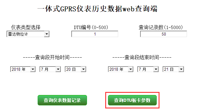 在设定好“仪表类型选择”,“DTU编号(0-500)”两个参数后,就可以查询DTU板卡参数。